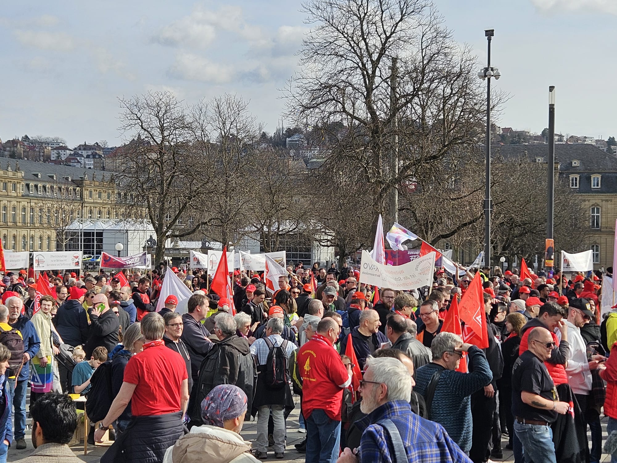Unter dem Motto „Zukunft braucht Menschen, Menschen brauchen Zukunft“ waren über 7.000 in der Stuttgarter Innenstadt am 28. Februar auf der Kundgebung, um sich für Zukunftsinvestitionen, soziale Sicherheit, starke Kommunen und den Erhalt von Industriearbeitsplätzen einzusetzen! Wenn es um sichere Arbeitsplätze, starke Kommunen, den Schutz des Sozialstaats und gute Arbeitsbedingungen geht, stehen die IG Metallerinnen und IG Metaller in den Betrieben solidarisch zusammen. Besonders stark vertreten waren die Kolleginnen und Kollegen der Ulmer Region, um sich nicht nur ihre Region, sondern für den Industriestandort Deutschland einzusetzen. Die Ulmer Kolleginnen und Kollegen starteten mit einem Demozug in Ulm und versammelten sich auf dem Schlossplatz mit dem IG Metall und ver.di Kolleginnen und Kollegen aus ganz Baden-Württemberg zur Kundgebung. Anschließend setzte sich die Menge zu einem Demonstrationszug durch die Stuttgarter Innenstadt in Bewegung und beendete den Aktionstag mit dem Aufsteigen von 1000 roten Luftballons.